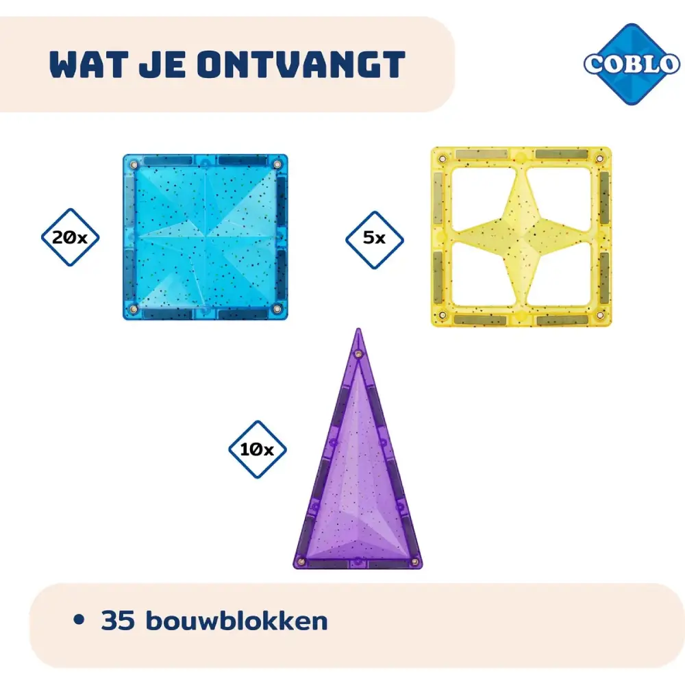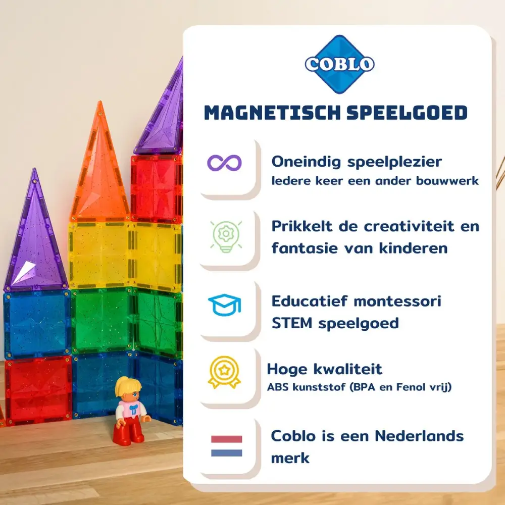 Coblo staat bekend om de sterke magneten en robuuste constructie van de bouwstenen, wat zorgt voor urenlang speelplezier. Deze Classic-set bevat geen glitter, maar wél dezelfde bouwkwaliteit en kleurrijke uitstraling waar Coblo om geliefd is. Het open-ended karakter van het speelgoed stimuleert creativiteit en vrij spel, zonder beperkingen.