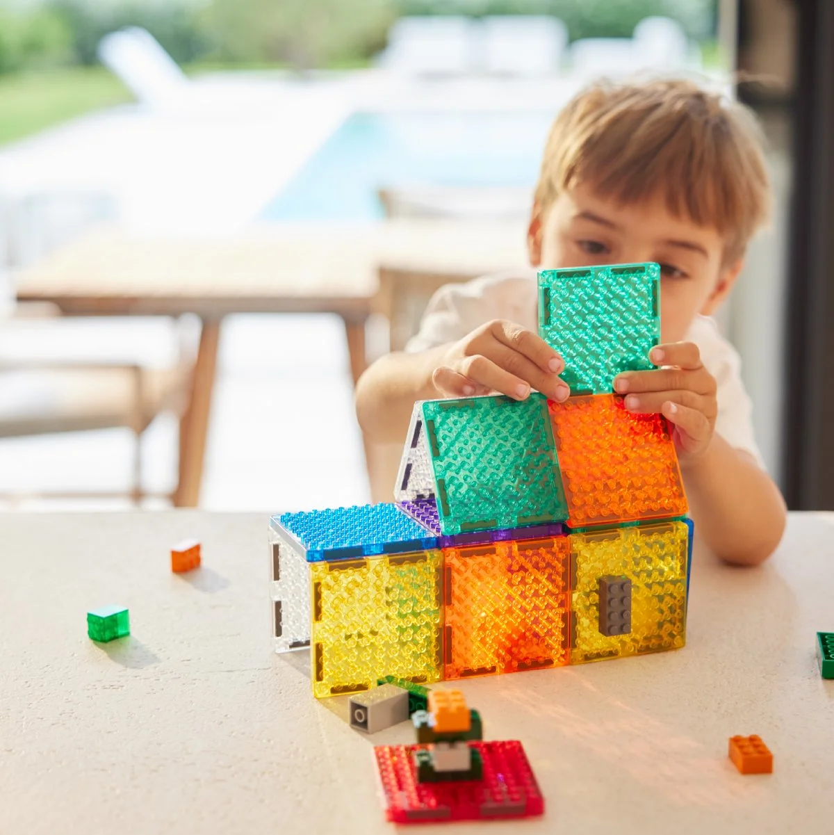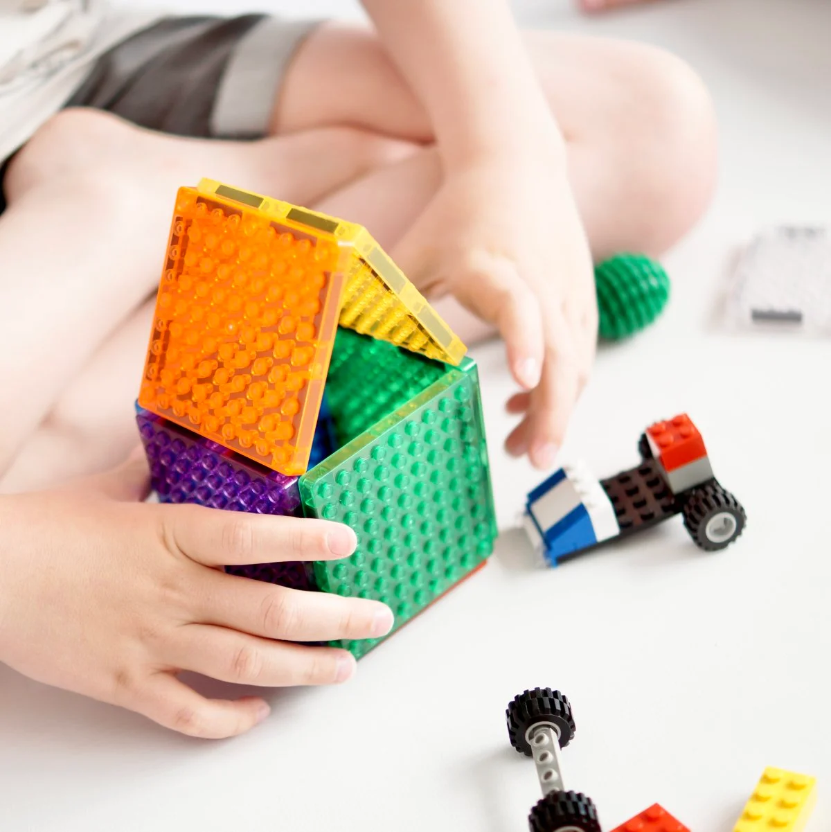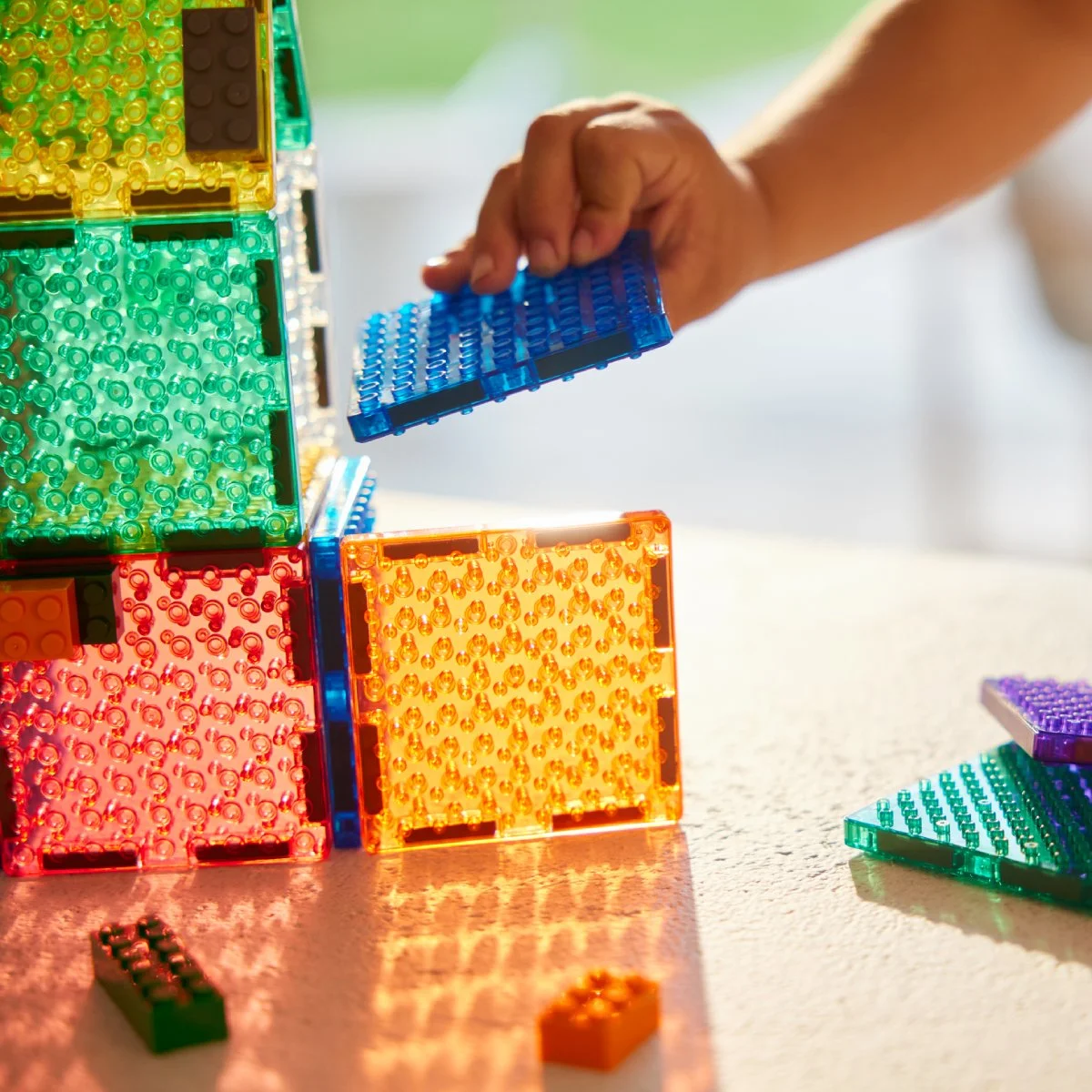 Met de Brick Tiles Pack Intense kunnen kinderen hun creativiteit naar een hoger niveau tillen. De tegels zijn speciaal ontworpen om perfect samen te werken met Lego® en Duplo®, waardoor kinderen unieke bouwwerken kunnen maken. Of ze nu bestaande constructies uitbreiden of iets nieuws bedenken, deze magnetische tegels maken elke creatie stabieler en speelser.