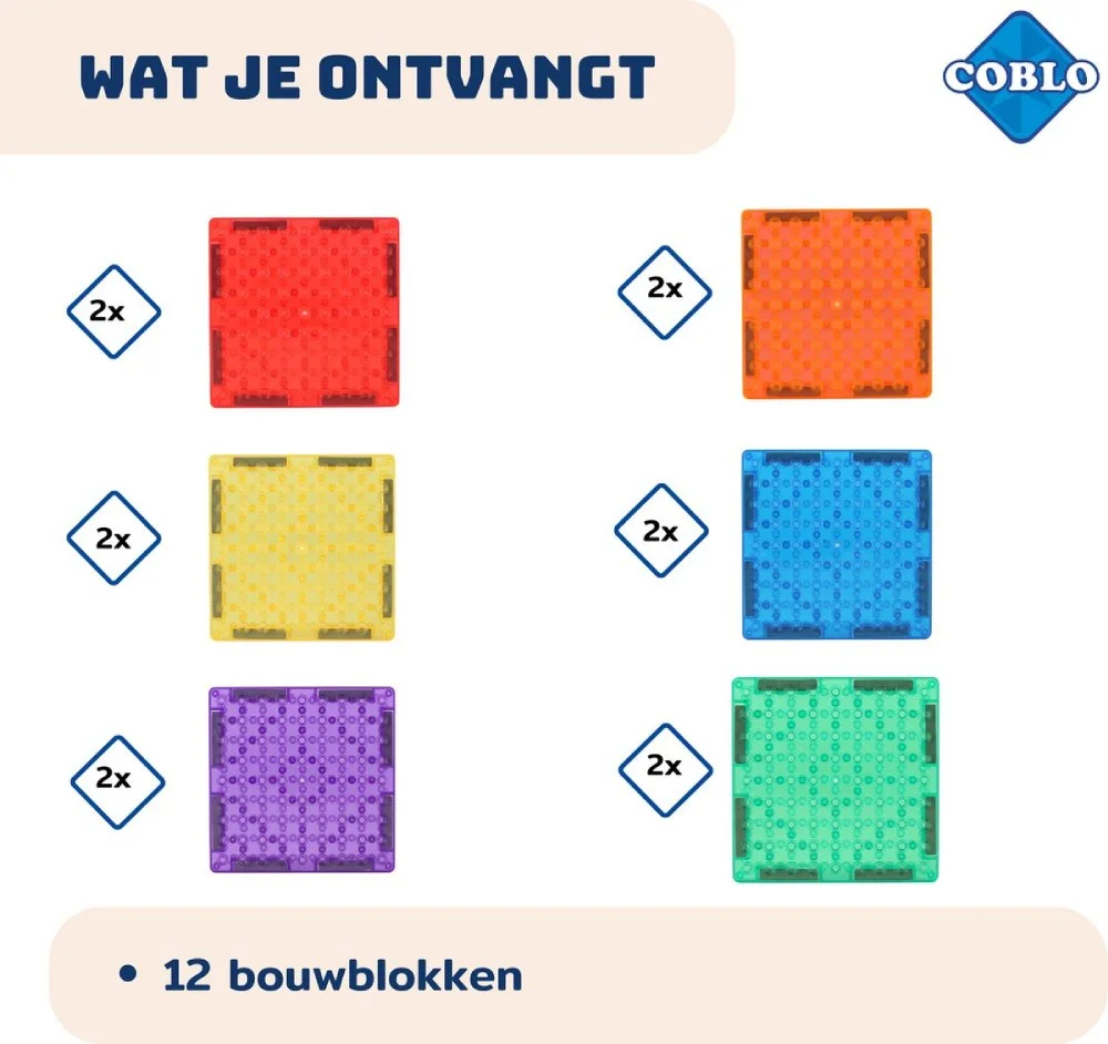 Met de Coblo Brick Classic 12-delige set ontdekken kinderen een wereld vol bouwplezier waarin magnetische tegels én bouwstenen samenkomen. Deze unieke combinatie tilt fantasierijk bouwen naar een hoger niveau. Of het nu gaat om een kleurrijke toren, een fantasiedier of een complete speelwereld: de mogelijkheden zijn eindeloos. Geschikt vanaf 3 jaar en gegarandeerd uren speelplezier!