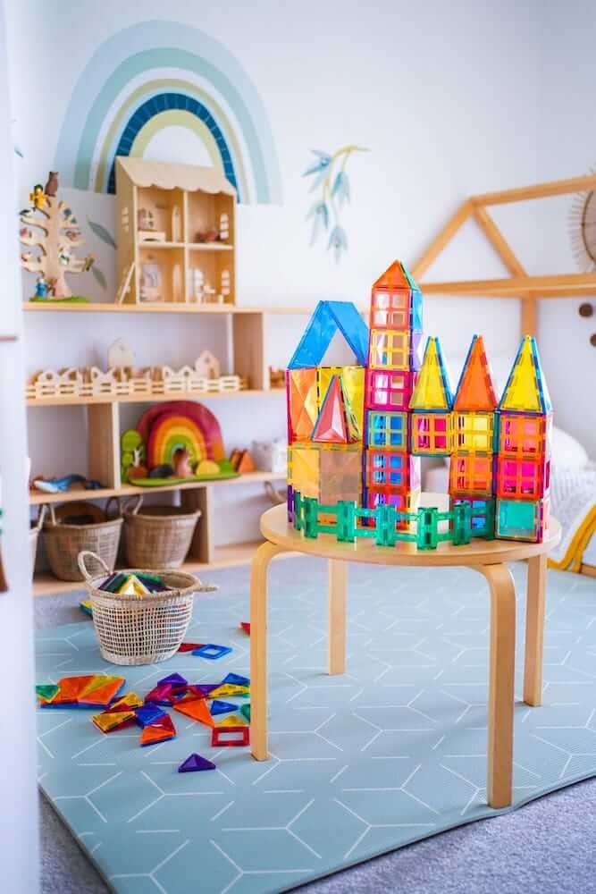 De tegels hebben sterke magneten en een uniek afgeschuind design. Dit zorgt ervoor dat kinderen grotere bouwwerken kunnen maken die stevig blijven staan, én het geeft een prachtig effect wanneer licht door de tegels schijnt.