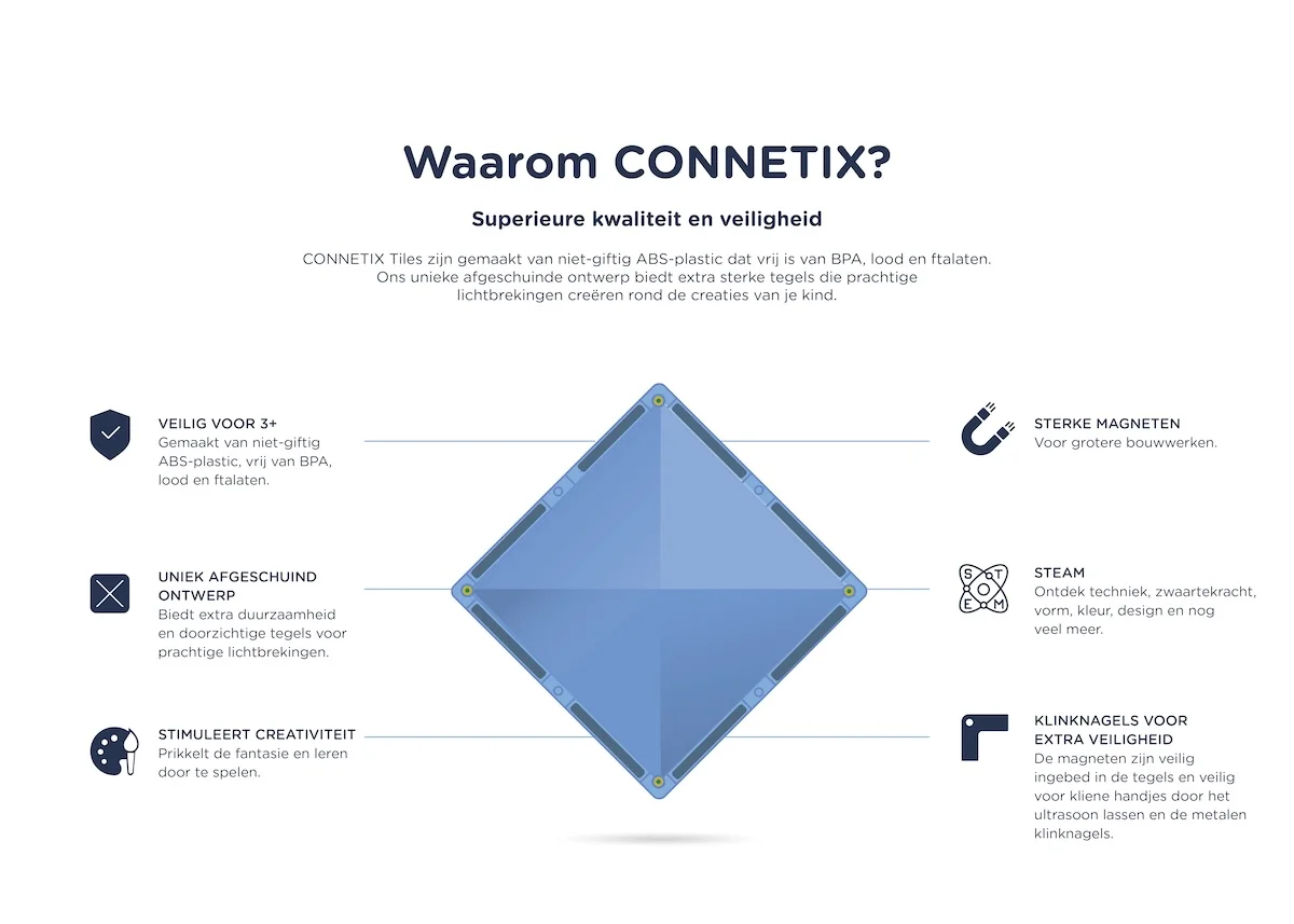 CONNETIX gebruikt een combinatie van ultrasoon lassen en metalen rivets. Hierdoor blijven de magneten stevig op hun plaats en zijn de tegels bestand tegen intensief gebruik door kleine kinderhandjes.