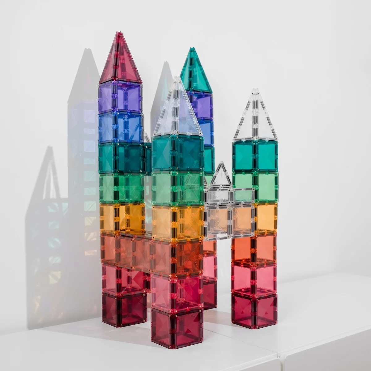 De tegels hebben sterke magneten en een uniek afgeschuind design. Dit zorgt ervoor dat kinderen grotere bouwwerken kunnen maken die stevig blijven staan, én het geeft een prachtig effect wanneer licht door de tegels schijnt.