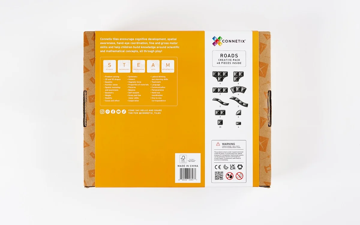 Met de CONNETIX 48-delige Roads Creatieve Set kun je de speelervaring naar een hoger niveau tillen en indrukwekkende architectonische hoogstandjes creëren. Deze set bevat een opwindend scala aan zorgvuldig ontworpen magnetische tegels, waaronder kwartcirkels, kruispunten, T-splitsingen en hellingen. De elegante zwarte tegels verbeteren de visuele ervaring van wegen, ramps, en startbanen. Door het weglaten van witte lijnen en wegmarkeringen, blijft de openheid en vrijheid van creatief spel behouden, waardoor kinderen de tegels kunnen gebruiken om hun eigen unieke constructies te maken.