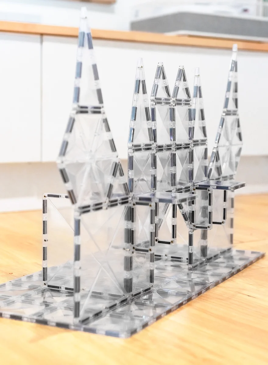 De tegels hebben sterke magneten en een uniek afgeschuind design. Dit zorgt ervoor dat kinderen grotere bouwwerken kunnen maken die stevig blijven staan, én het geeft een prachtig effect wanneer licht door de tegels schijnt.