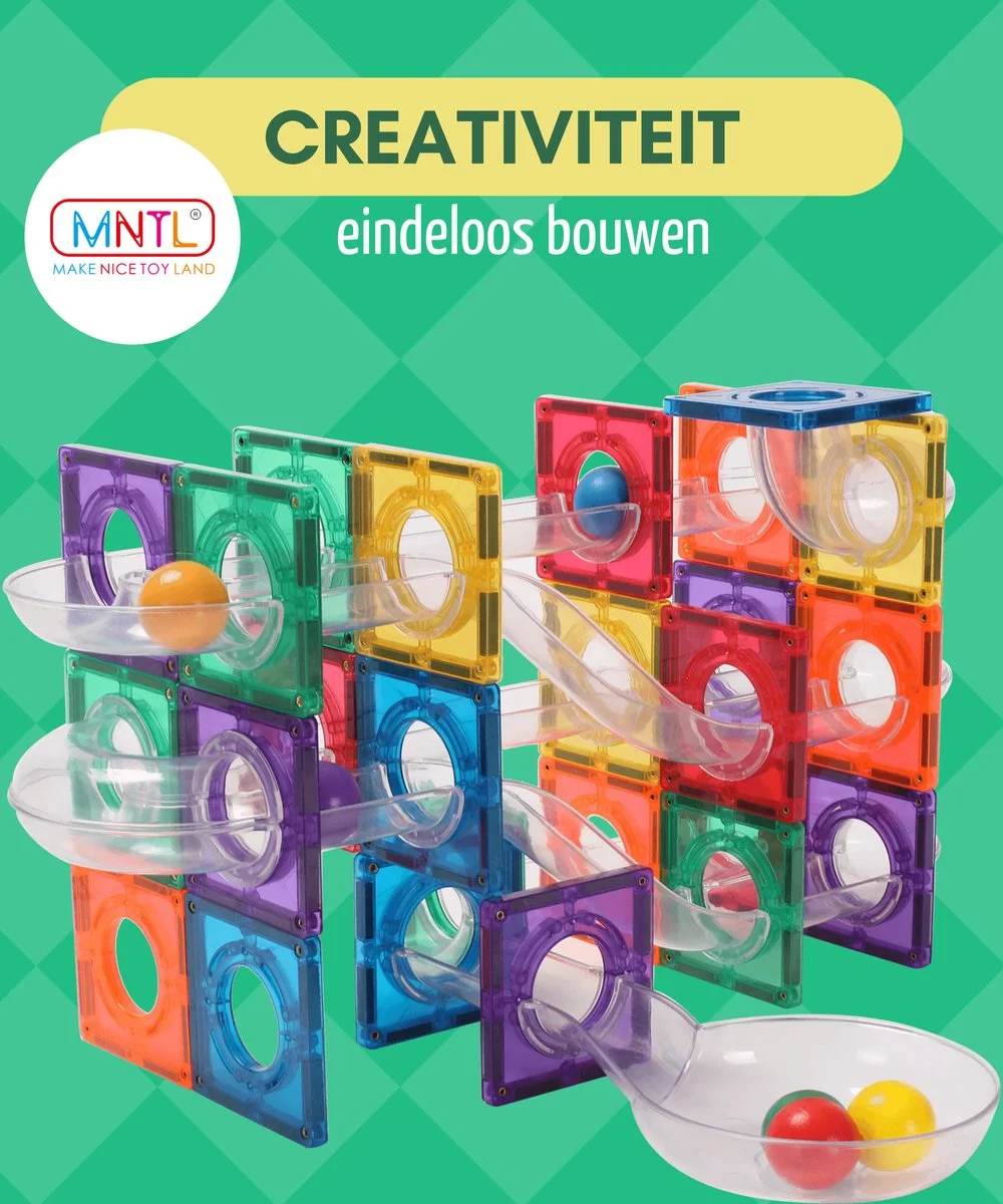 Deze set is extra bijzonder door de toevoeging van knikkerbaan-onderdelen en echte knikkers, waarmee kinderen een dynamisch speelelement kunnen toevoegen aan hun creaties. Zo bouwen ze niet alleen torens of kastelen, maar ook spannende knikkerbanen – voor nog meer variatie en plezier.
